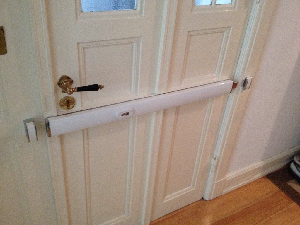 | Panzerriegel, auch Querriegel genannt, sichern die Tür über die ganze Breite und sind seitlich mit Mauerankern tief in der Wand verschraubt. Auf diese Weise lassen sich auch einfach gebaute Türen effektiv gegen Einbruch schützen. Auch in schwierigen Fällen können wir Panzerriegel montieren. Im Bild sehen Sie zum Beispiel die Montage eines Querriegels an einer alten, sogenannten Hamburger Tür. Wir beraten Sie gern und kostenlos an Ihrem Objekt. |